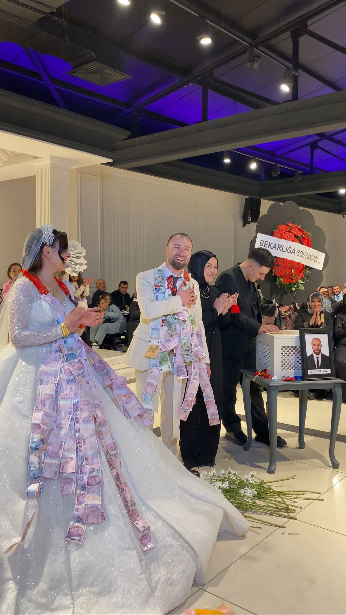 “Bekarlık Son Şansındı” yazılı Çelenkle Salona giren damadın arkadaşları beyaz karanfil bırakarak genç çifti tebrik ettiler.